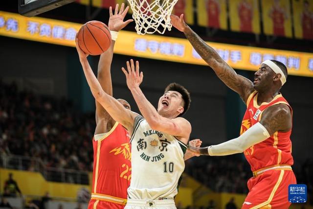 3月11日,南京天之蓝队球员郭昊文(中)在比赛中上篮。新华社记者 江汉 摄