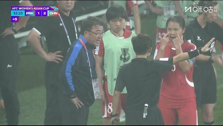 女足亚洲杯小组赛第三轮,中国女足2-1击败朝鲜女足,时隔20年后再次在洲际大赛中战胜对手,令人信服地拿下了小组头名。上半场末段出现了争议事件,朝鲜女足在防守中造越位失败,王霜门前抢点破门反超比分,朝鲜女足主帅李成镐带领球员们抗议裁判判罚,导致比赛一度中断。