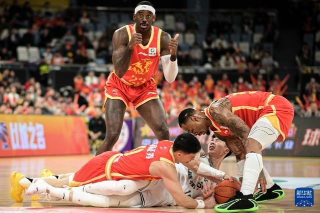 3月11日,浙江浙商证券队球员林秉圣(下左)、雷琼·塔克(右一)与南京天之蓝队球员郭昊文(右二)在比赛中拼抢。新华社记者 江汉 摄